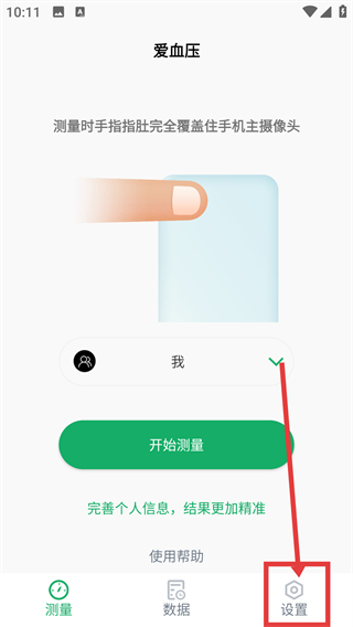 1、在爱血压的测量页面,点击底部的【设置】选项,就能进入功能设置的操作界面啦。