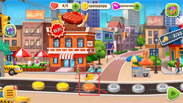 1、找到标注【新的】的餐厅建筑,点击下方被框选的【钥匙】标识,即可解锁进入该餐厅的烹饪关卡。