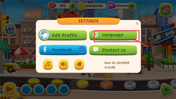 3、进入【SETTINGS】面板后,找到被框选的【Language】按钮,点击它可打开语言选择界面,调整游戏显示语言。