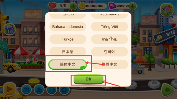 4、在语言选择界面中,选择【简体中文】选项,再点击【OK】按钮,即可将游戏显示语言切换为简体中文。