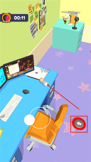 2、进入场景后,留意上方的【00:11】倒计时,点击被框选的按钮,可调整角色的移动方向推进流程。