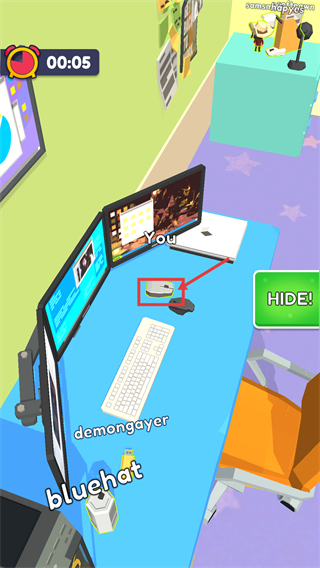 3、观察桌面区域,已变成道具,同时留意【HIDE!】按钮,为后续隐藏操作做准备。
