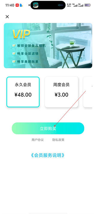2、进入个人中心后,点击【开通会员】按钮,可进入VIP开通页面,解锁全部复古相机、滤镜等功能。