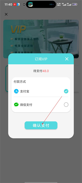 4、在订阅VIP的支付弹窗中,选择【支付宝】或【微信支付】方式,点击【确认支付】完成会员购买。