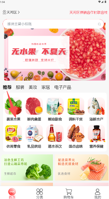 1、打开软件浏览首页推荐点击“蔬菜水果”搜索目标商品。