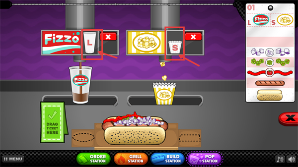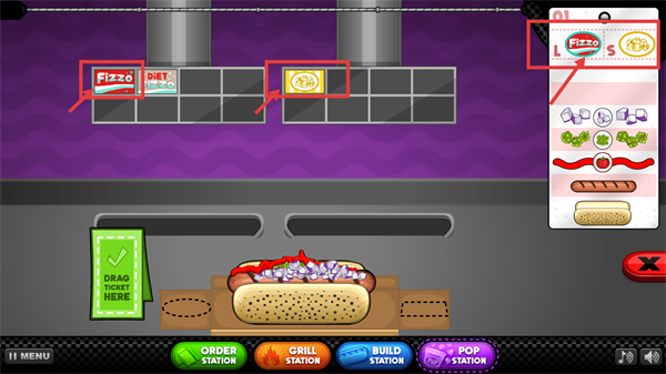 2、在配餐界面,参照右侧订单要求,选取【Fizzo】饮品与【爆米花】,搭配已制作的热狗,完成餐食组合。