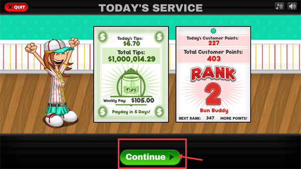 4、当日营业结束后,会显示【Today's-Tips】等收益数据与【RANK-2】的评级,点击【Continue】按钮可继续后续经营。