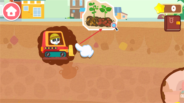 5、允许宝宝驾驶工程车挖掘闪闪发光的宝石,同时观察土里生长的土豆,在趣味操作中丰富对地下物产的认知。