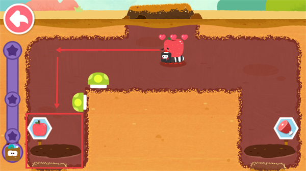 2、沿【红色箭头】所示路径移动角色,避开【蘑菇】障碍,抵达【苹果】所在区域,完成该区域的收集目标以推进关卡。