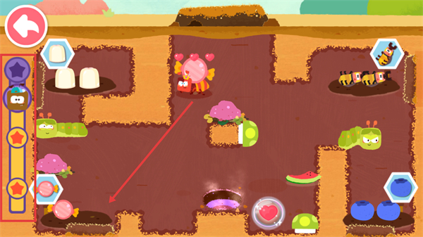 3、按【红色箭头】规划的路线行进,避开【毛毛虫】类障碍,收集沿途【水果】与【心形道具】,达成该区域的收集任务。