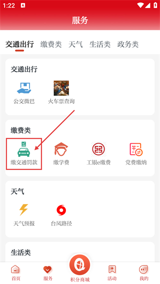 2、进入【服务】页面后,在【缴费类】板块中点击【缴交通罚款】选项,可进入公共支付相关页面处理交通罚款事宜。