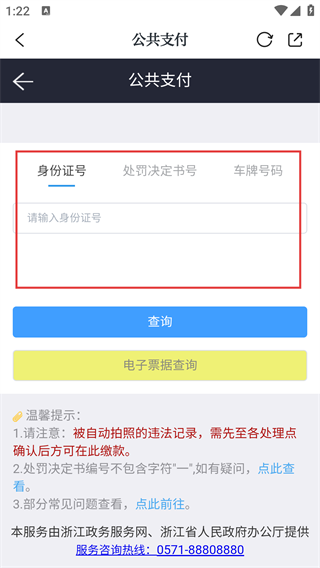 3、进入【公共支付】页面,选中【身份证号】标签,输入对应身份证号信息后,点击【查询】按钮进行交通罚款查询。