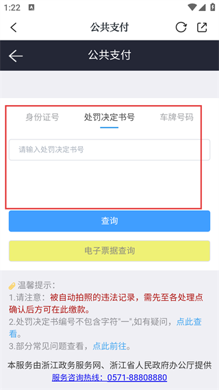 4、在【公共支付】页面,切换到【处罚决定书号】标签,输入对应决定书号,点击【查询】按钮继续交通罚款相关操作。