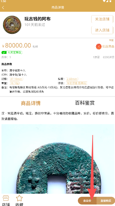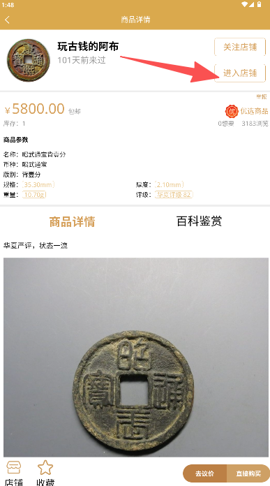 1、在商品详情页玩古钱的阿布点击进入店铺。