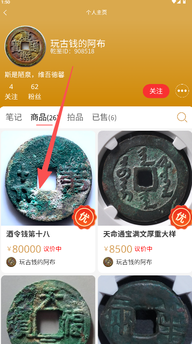 2、点击目标商品查看评级及卖家信息确认钱币详情。