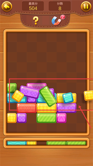 2、操作后方块会重新排布,关注被框选区域的方块组合,继续匹配同类方块完成消除,逐步积累分数靠近【最高分-504】。
