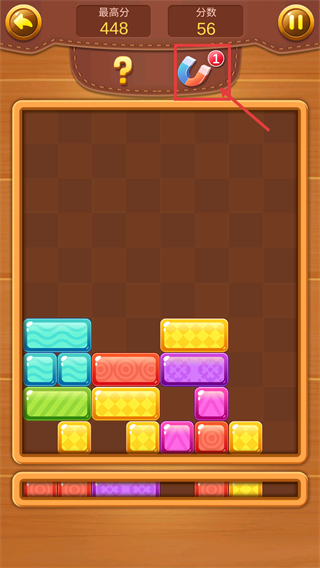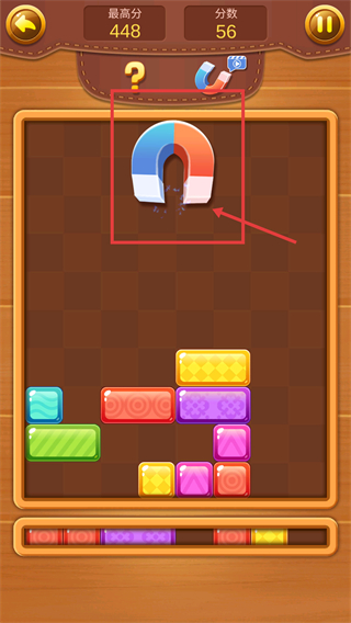4、使用【磁铁】道具后,其会在界面中生效,自动消除对应方块,助力提升分数,向【最高分-448】靠近。