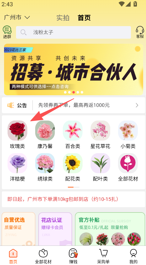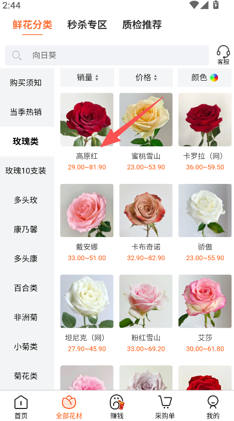 1、提供花材分类浏览功能,点击首页的花材分类,可查看玫瑰类等各类鲜花的具体品类。
