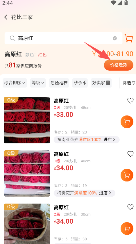 2、整合多家供应商资源,同一花材展示不同商家的价格、库存,便于进行采购对比与选择。