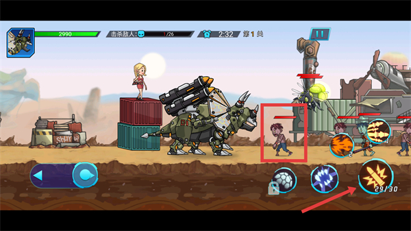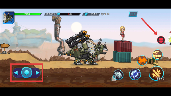 2、操控机甲靠近红框内的敌人后,点击右侧技能图标发起攻击,推进关卡进度。