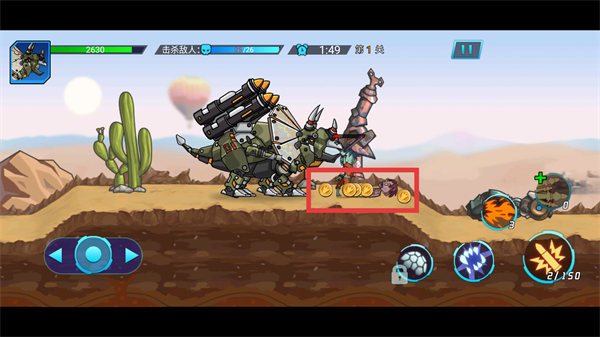 3、击败敌人后,机甲移动至红框内的金币区域,拾取掉落的金币道具。