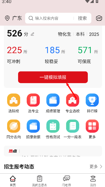 1、进入首页后点击“一键模拟填报”,即可进入志愿模拟界面。