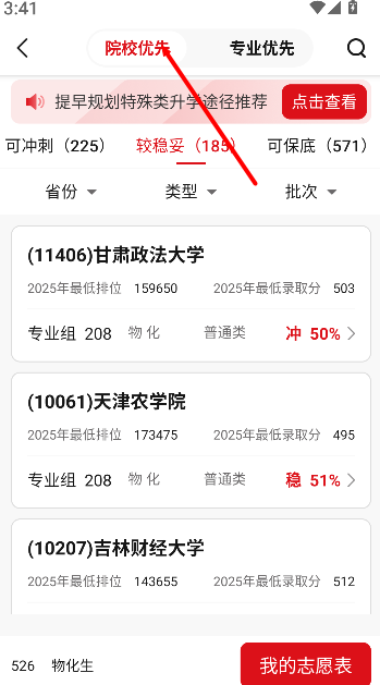 2、在页面中选择“院校优先”模式,按院校方向查看匹配结果。