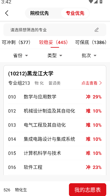 3、也可切换到“专业优先”模式,根据兴趣方向查看推荐专业与院校。