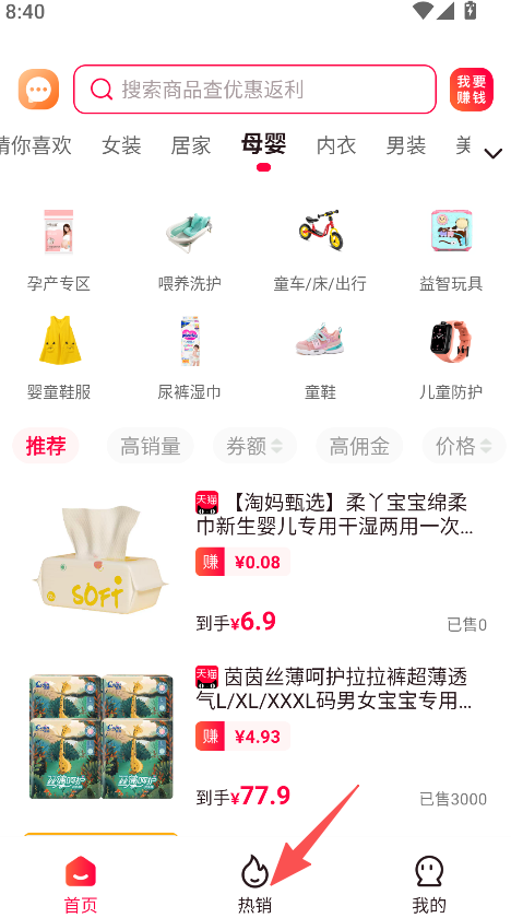 《淘全》是一款电商购物类软件,设首页、热销、我的等板块,首页有搜索栏可查优惠返利,分类含女装、母婴、居家等,母婴类下分孕产专区、喂养洗护等细分内容,支持全部分类筛选,商品标注到手价、返利金额,可按高销量、券额等维度排序,整合购物与优惠返利功能,助力查找优惠商品、分类筛选、查看返利收益,满足日常购物的选品与优惠获取需求,适配多样的消费场景。