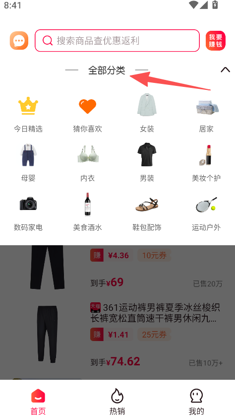 1、提供分类筛选功能,点击全部分类,可选择母婴、男装等类别查找对应领域的商品内容。