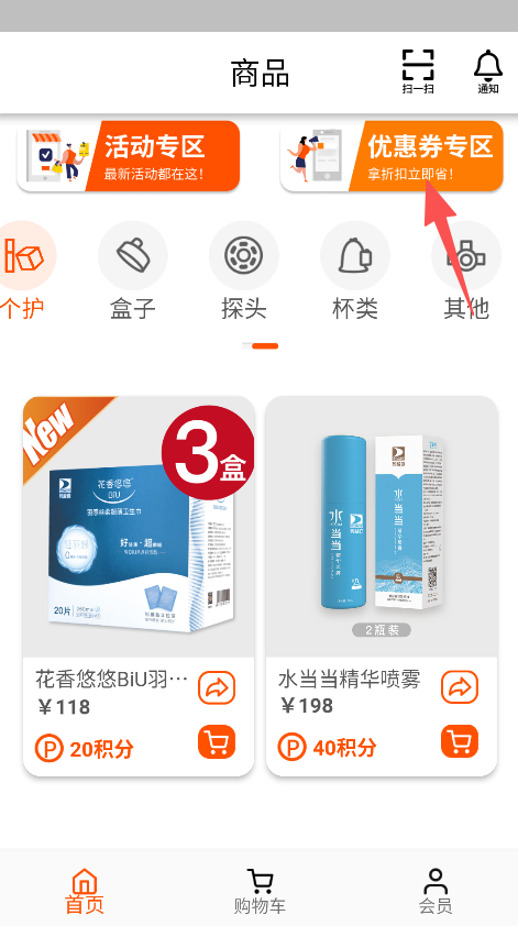 1、聚焦特定商品购物,设活动、优惠券专区,分类含个护、探头等,适配对应商品的采购与消费需求。