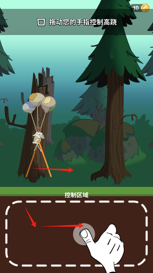 1、进入游戏,按住下方的控制区域滑动,山羊踩着高跷就会向前走。