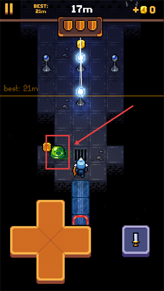 2、获取【Shield】道具,它能抵御多数伤害但对移动墙、电与火无效,每次地牢探索限用2次,合理规划使用时机。