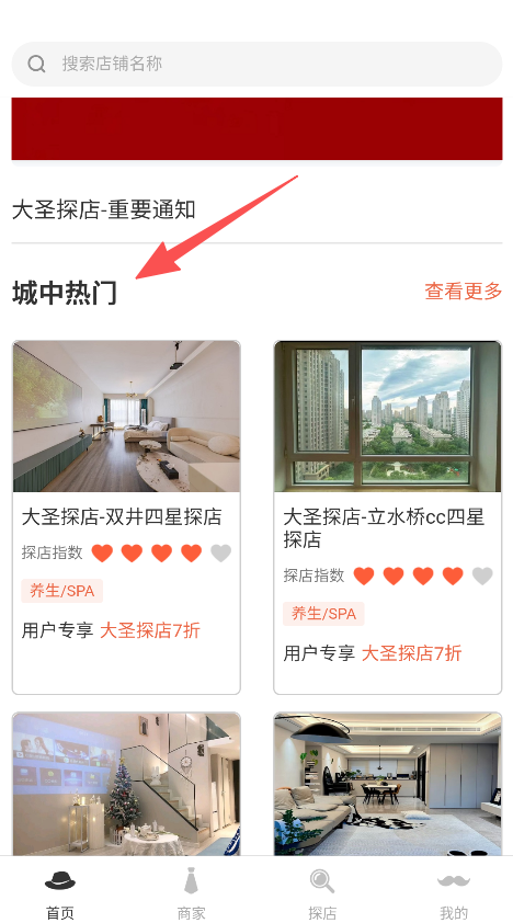 1、打开大圣探店进入首页,点击城中热门板块查看探店信息列表。