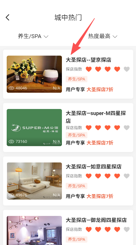1、提供探店列表查看功能,进入首页城中热门板块,查看养生/SPA类等本地探店信息列表内容。