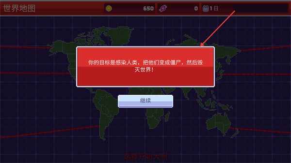 1、进入游戏后明确目标为感染人类变成僵尸并毁灭世界,点击继续开启僵尸入侵的战略挑战。
