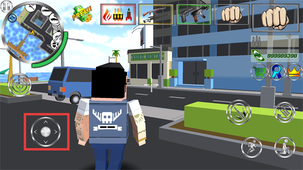 2、通过红框内的方向键操控角色移动,界面上方显示武器道具栏,在城市场景中推进游戏流程。