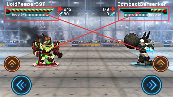 1、虚拟按键遥控操纵方式贴近真实,冲锋、跳跃等核心操作便捷易控,新手也能快速掌握对战节奏,专注机器人格斗策略的施展。