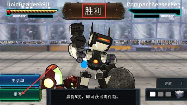 4、达成【胜利】后,可点击【重赛】积累胜场,累计赢3次即可获得【零件箱】,用于机甲养成。
