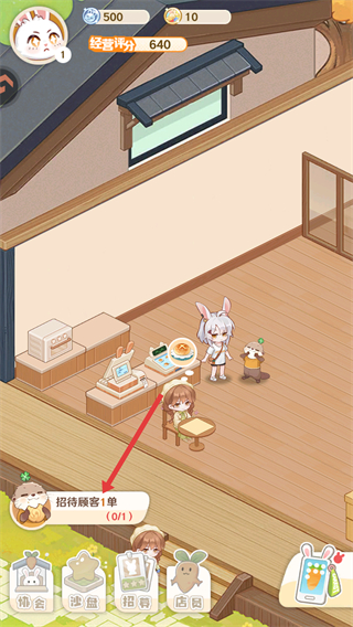 1、在店铺主界面,找到“招待顾客1单”的提示区域,点击对应操作区域,触发顾客订单流程。
