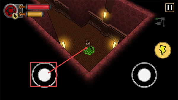 1、操控左侧移动按钮,控制角色移动至目标区域,同时留意左上角的状态条(红色、黄色),维持角色状态稳定。