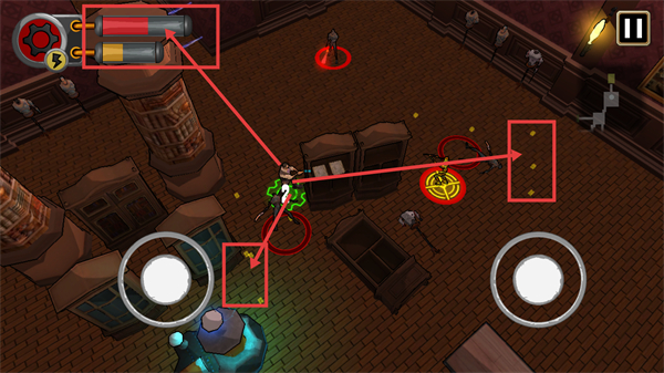 3、战斗过程中关注左上角状态条的消耗,拾取地面黄色道具补充资源,优先处理带有红色光环的敌人。