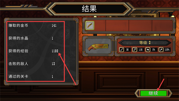 4、关卡结束后查看收益(金币141、经验1180等),领取等级2的武器奖励,点击【继续】进入下一轮挑战。