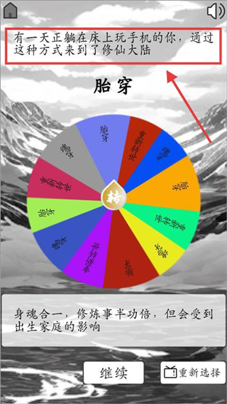 3、转盘随机选穿越方式如【胎穿】,影响初始属性,可点【继续】或【重新选择】调整。