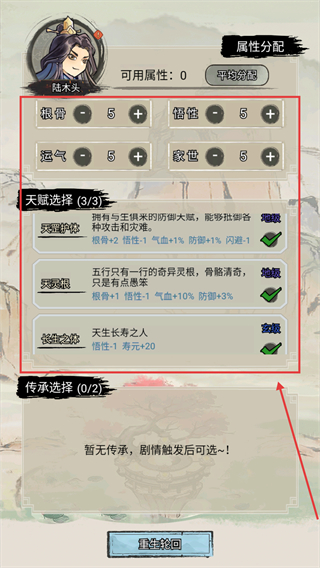 1、创建角色时合理分配【根骨】-【悟性】-【运气】-【家世】属性点,选【天罡护体】-【天灵根】-【长生之体】天赋增强生存力。