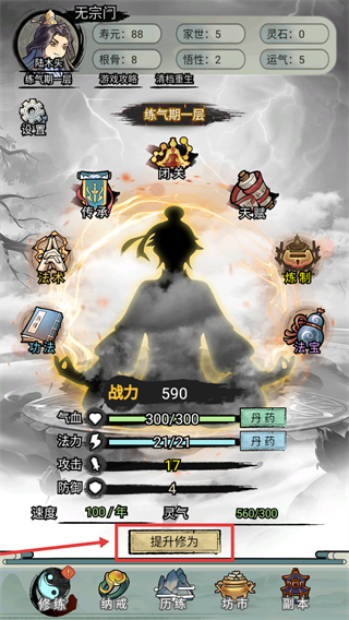 3、点击【提升修为】积累灵气突破境界,学习【功法】-【法术】提升战力,应对后续敌人与挑战。