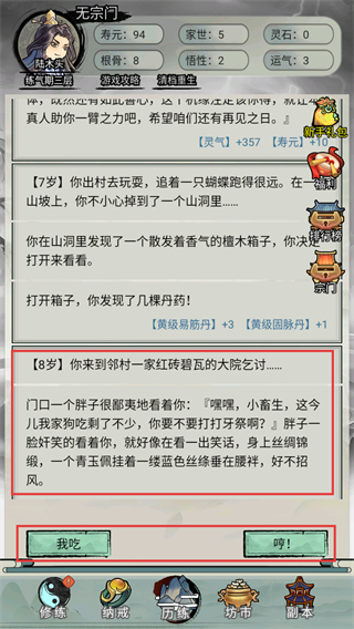 4、历练选择中权衡【我吃】-【哼!】选项,根据角色发展方向选,影响后续剧情与属性走向。