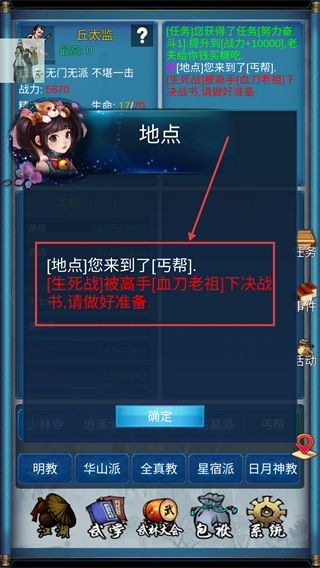 3、抵达【丐帮】后触发【血刀老祖】决战事件,需提前提升战力,做好战斗准备应对挑战。