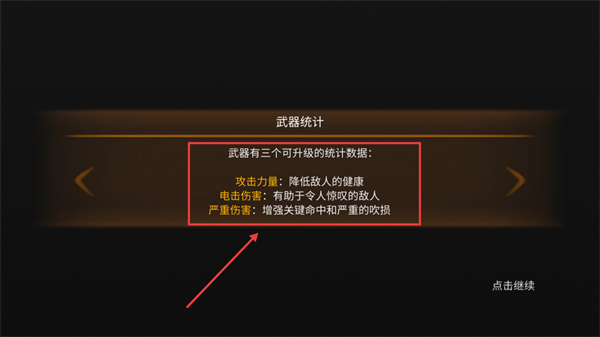 2、武器有【攻击力量】【电击伤害】【严重伤害】三个可升级属性优先提升攻击力量降低敌人健康值。