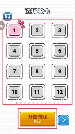1、进入【选择关卡】界面,选定已解锁的【1】关卡,点击下方【开始游戏-第1关】按钮,即可进入对应关卡开始挑战。